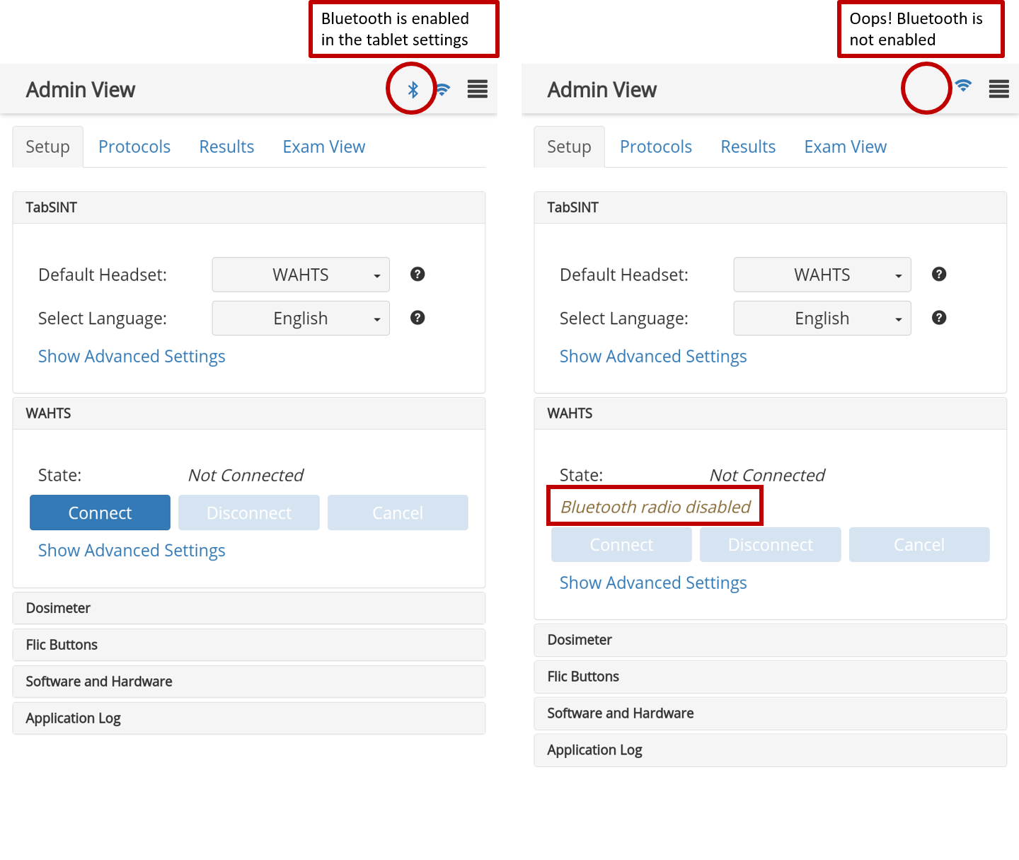- Make sure the tablet Bluetooth is turned on, or you will see the message "Bluetooth radio disabled"