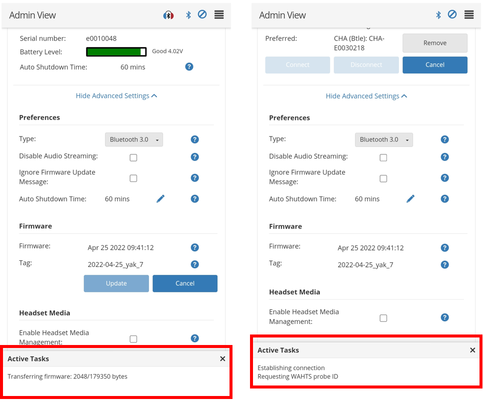 - When a headset is connecting, firmware is loading or there are other Active Tasks, a task bar will show at the bottom of the page.