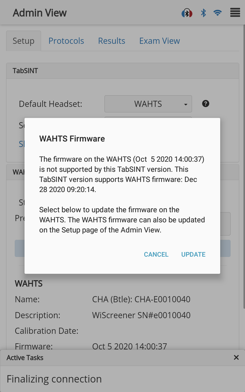 Each version of TabSINT requires a specific WAHTS firmware. If the headset connected to TabSINT does not have the required firmware, you will see an Alert and you will need to update the firmware.