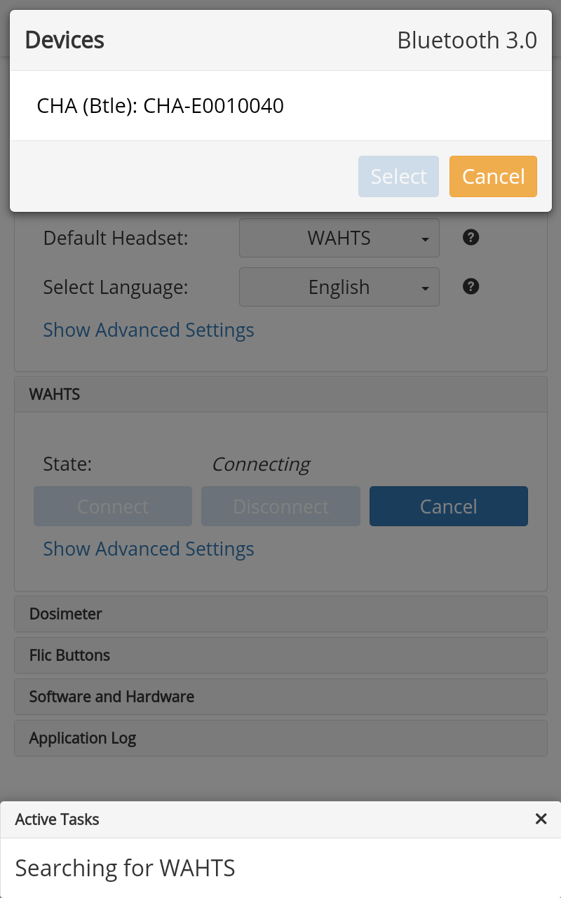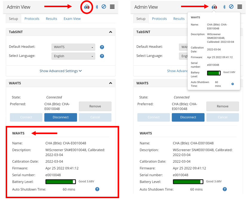 - Once connected a Headset with Bluetooth icon will appear in the upper bar and an additional WAHTS panel will appear. This panel identifies the Name or serial number, the Calibration Date, the Firmware installed, and the Battery Level of the connected WAHTS (CHA), and the Auto Shutdown Time. Follow directions in Configuration section to edit the Auto Shutdown Time. (note: headsets calibrated before September 16, 2020 will not show a Calibration Date).