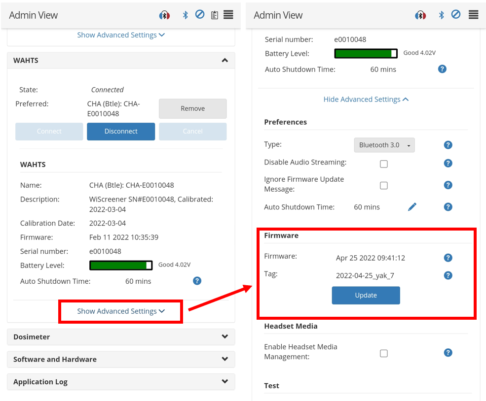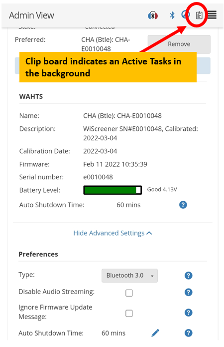 Select Update from the WAHTS Firmware alert OR select Show Advanced Settings in the WAHTS section. There you can see the firmware that is on the WAHTS vs the firmware that this version of TabSINT requires to function properly. Select the blue Update button. The firmware will begin to transfer and you will see the progress under Active Tasks.