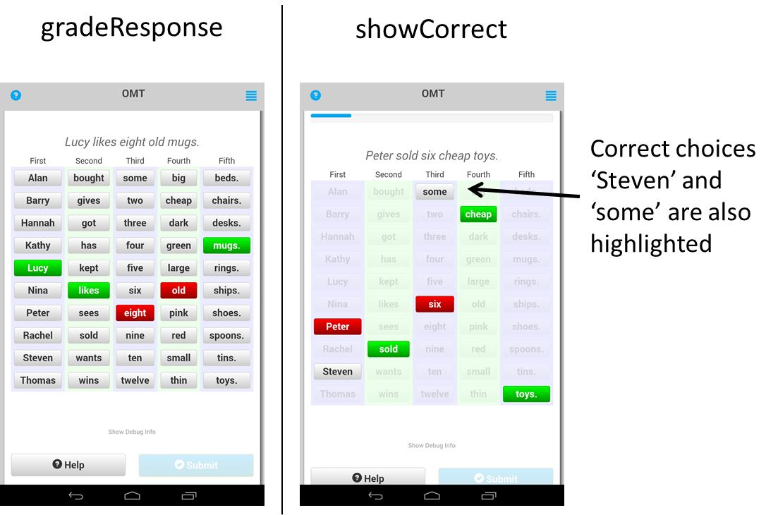 gradeResponse: will mark answers correct (red) and incorrect (green).showCorrect: will mark answers correct/incorrect AND reveal correct answers the user missed.