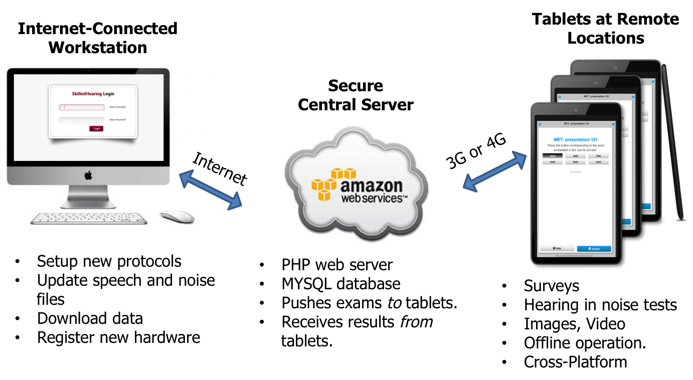 TabSINT follows a standard client-server architecture. There are two types of client devices: tablets (which administer exams) and standard administrator computers, which allow administrators to upload protocols, and to browse and download results. The central server resides on Amazon Web Services and is backed up regularly.