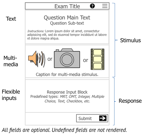 Each page is composed of UI components, which are arranged in the same order on every page. An exam page might include all, some, or (in the case of an empty page), none of these components. Taken together, these highly configurable components can create a very diverse range of exam pages.