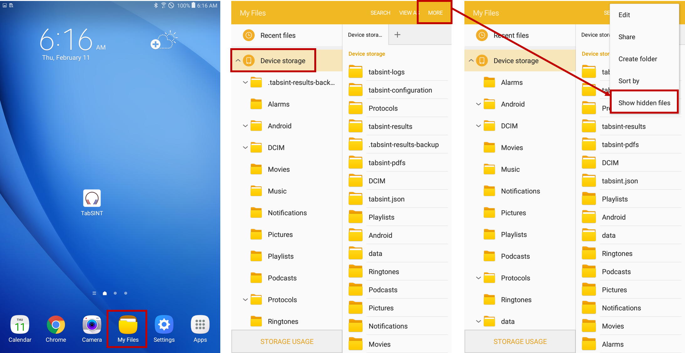 If .tabsint-logs is not visible in Device Storage, select More at the upper right corner, then select Show hidden files