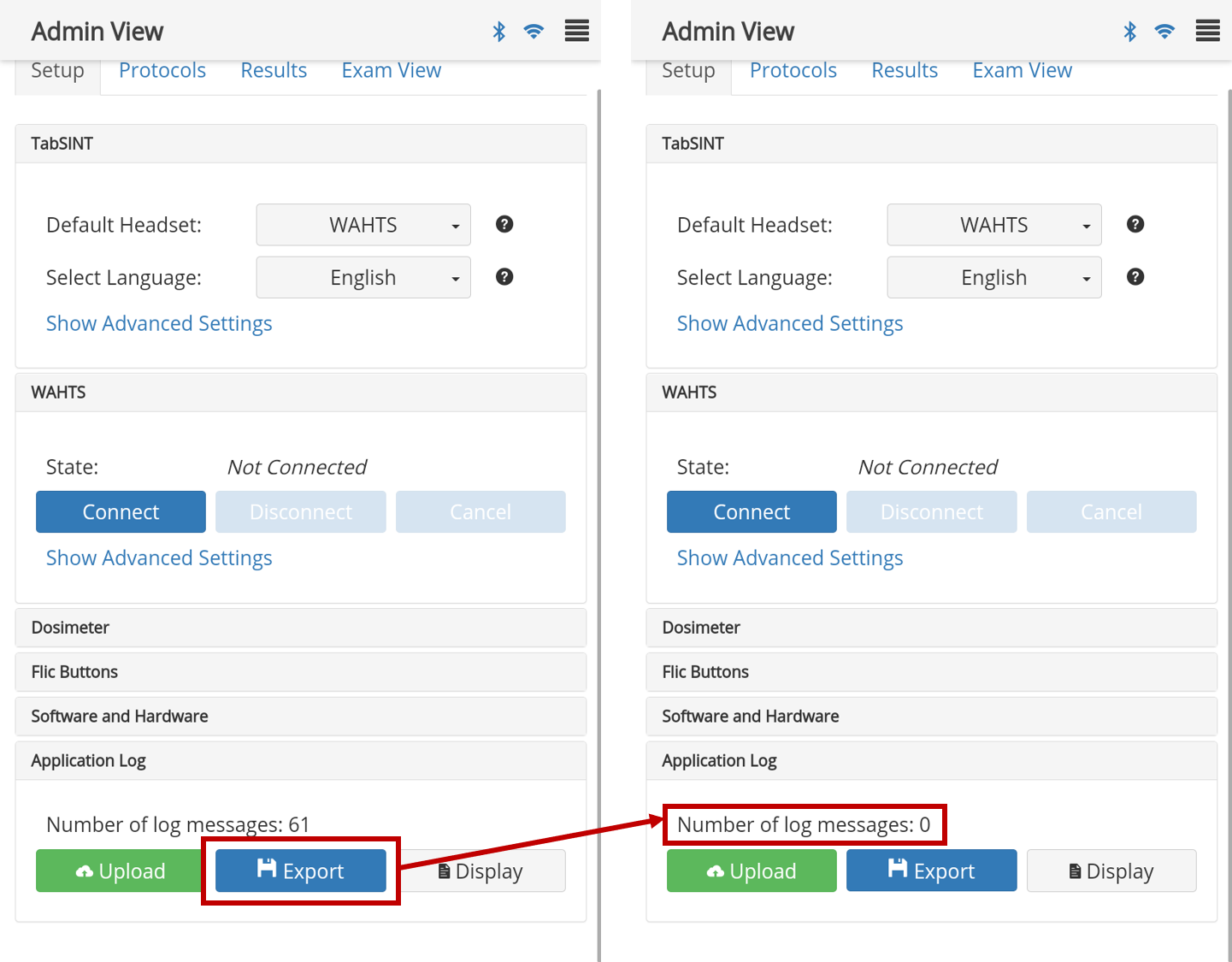 1. The WAHTS has been idle for greater than 15 minutes and has entered Sleep Mode. Due to the idle state of the WAHTS and thus lack of communication with TabSINT, the WAHTS may show as still connected when in fact it is not. Attempting to run an exam will result in an error message and a prompt to reconnect to the device.