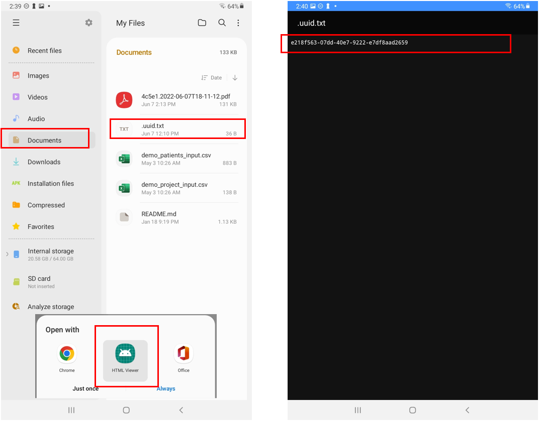 • The full UUID is also viewed in the Documents folder as a .uuid.txt file. This file can be viewed by selecting the file and then selecting HTML Viewer.
