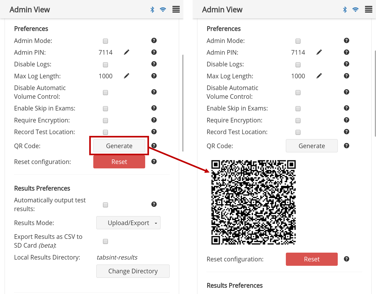 Once a tablet is configured in TabSINT with the desired settings a QR Code can be generated directly on that tablet.