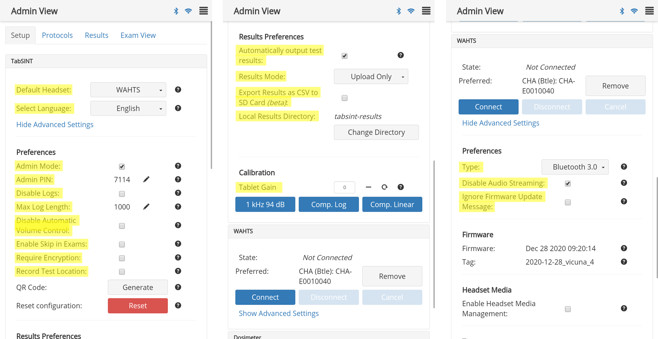 - The below example changes the Admin settings accordingly: the default headset to WAHTS; disables logs; unchecks Admin mode; and requires results to be encrypted. All other parameters will be the default settings.