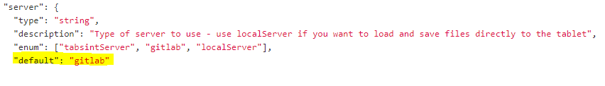 For all parameters not set, the default setting will be implemented. The defaults settings are noted in the Configuration Schema. For example below, the default server is set to gitlab, with tabsintServer and localServer being the other options.