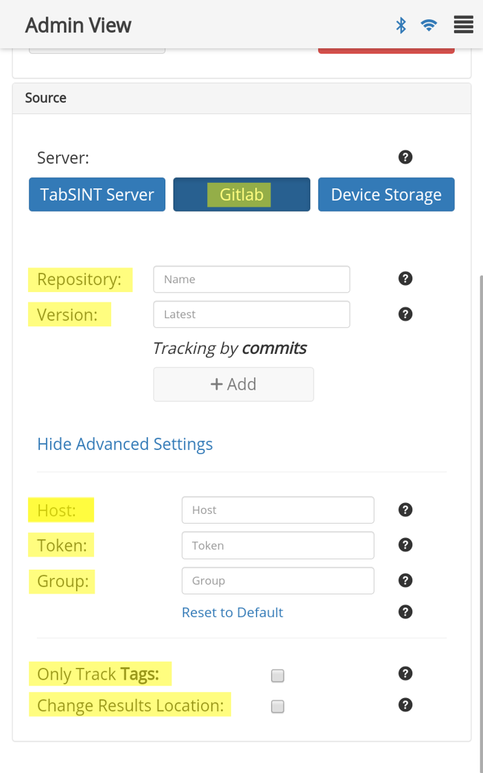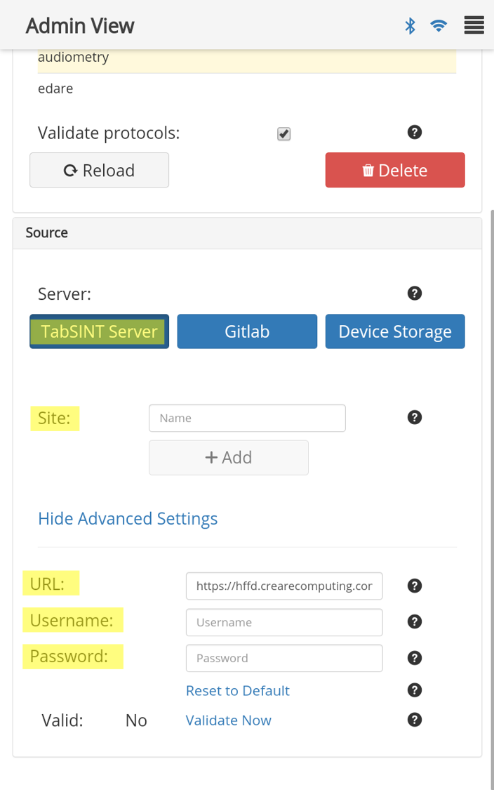 - The below example sets the server to GitLab and provides credentials to the "creare-com/tabsint-protocols" group. It sets the repository to "sandbox" and loads the sandbox protocol onto the tablet. Admin settings are set to: Default headset WAHTS; Results to Upload Only; Record the test location; and requires results to be encrypted. All other parameters will be the default settings.